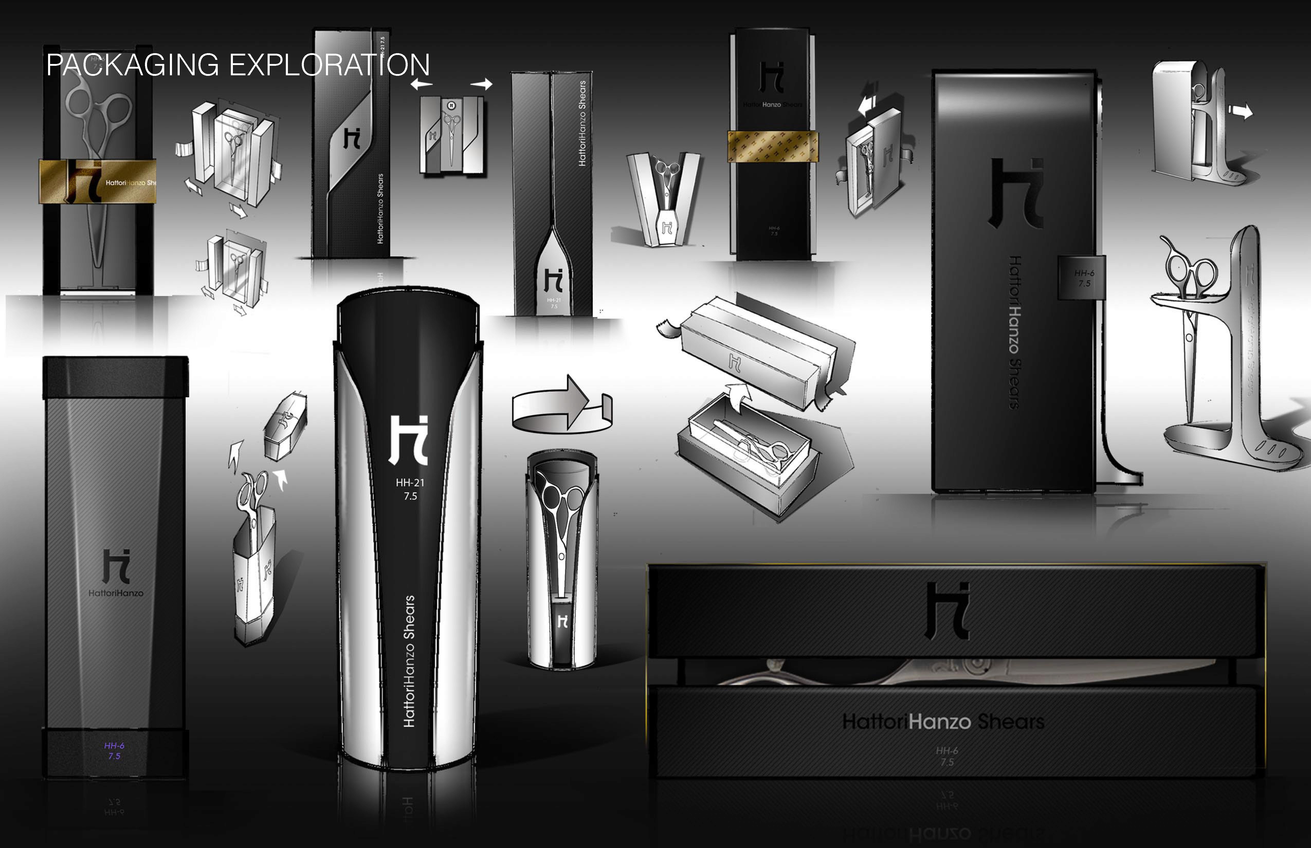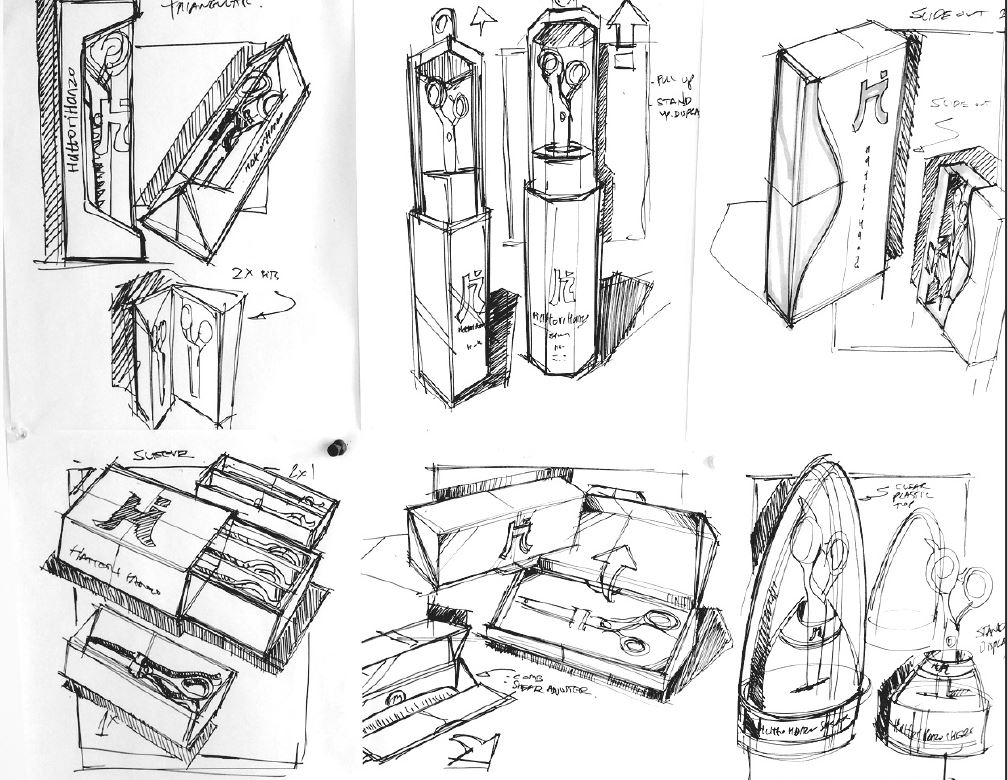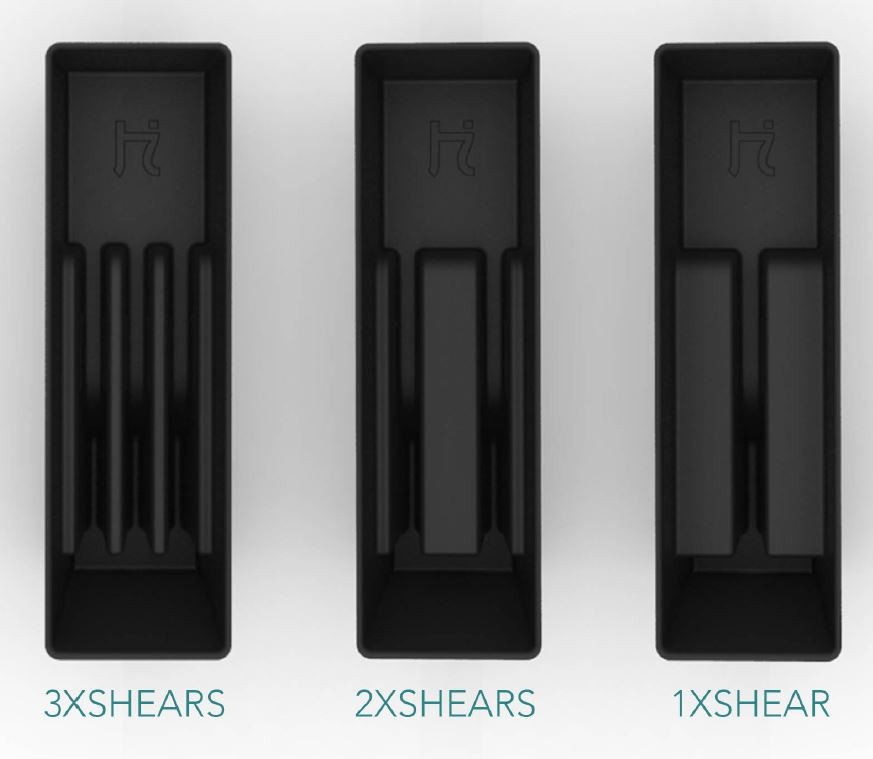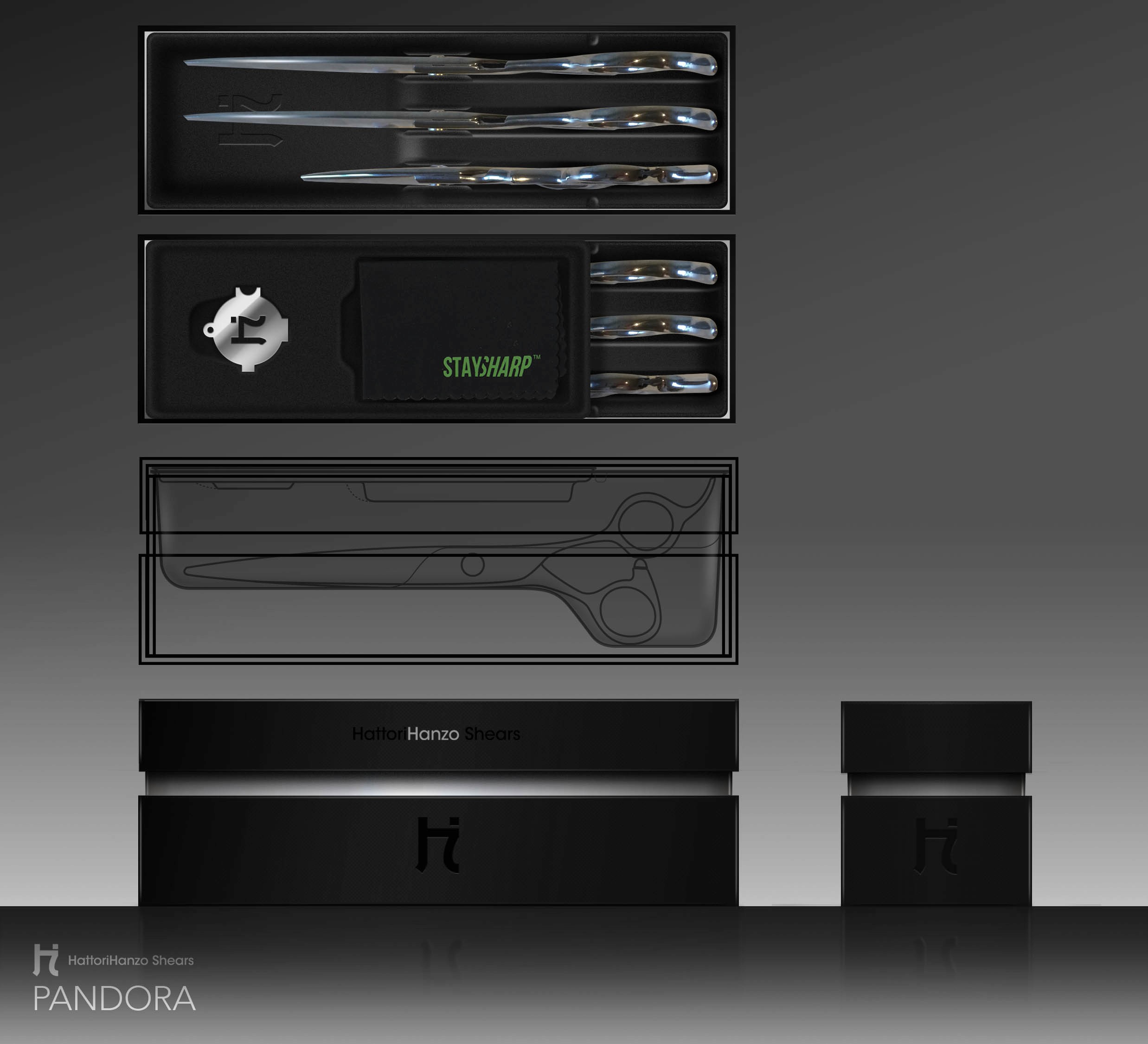 Crafted premium packaging for HattoriHanzo Shears, blending timeless elegance, protective design, and dual-purpose utility. The packaging design securely holds the shears shut and features modular trays that accommodate up to three shears of any size, with stackable elements for versatile storage and display. Each package includes a tension key and shimmy, enhancing both functionality and user experience.