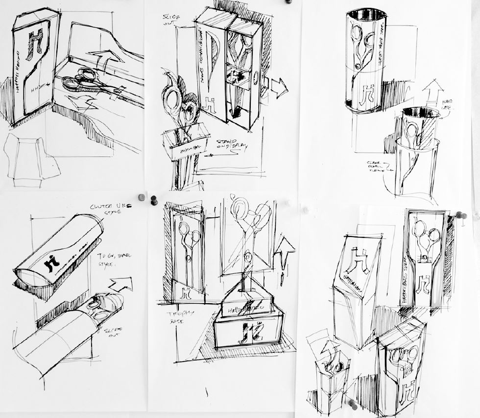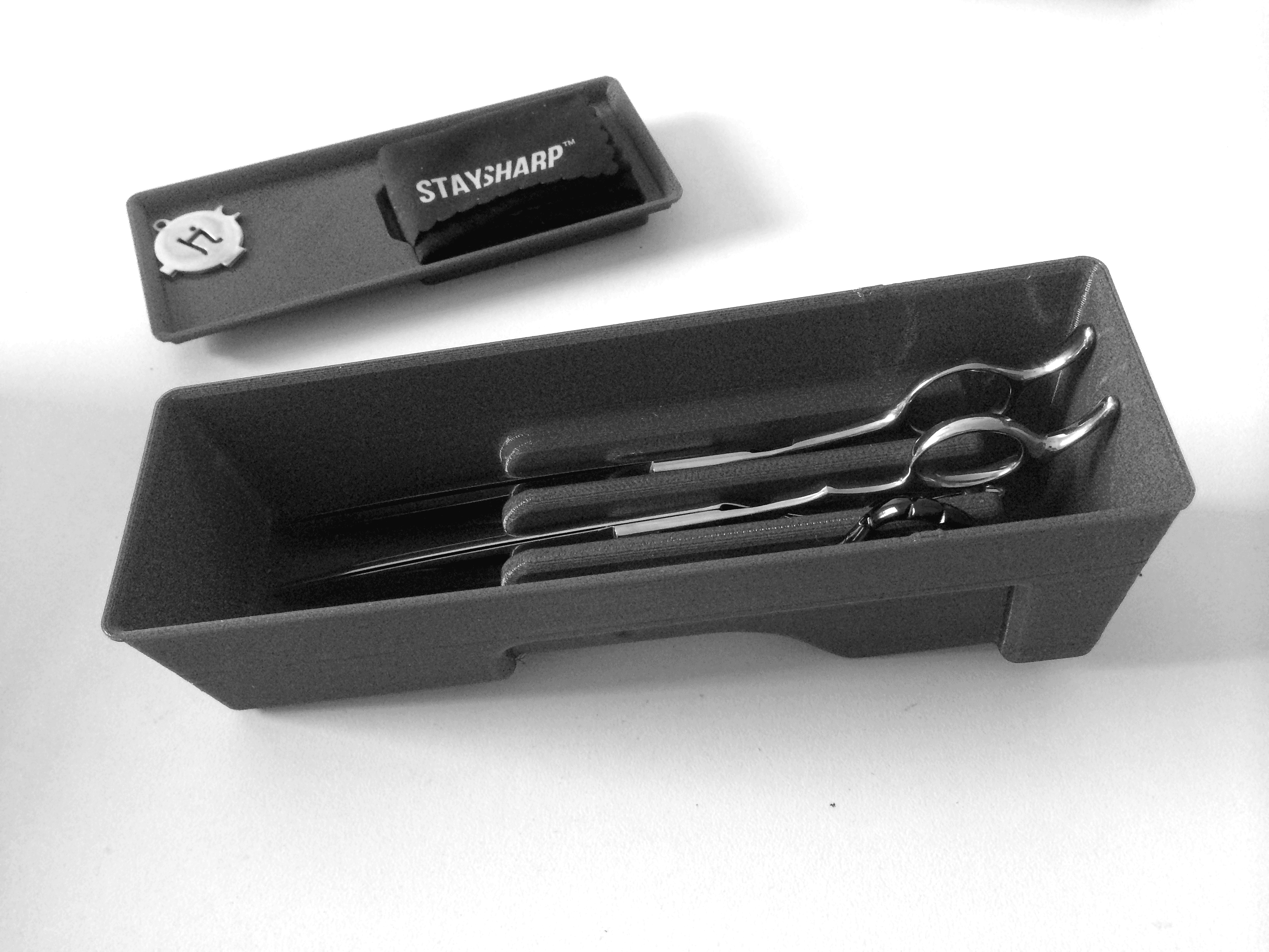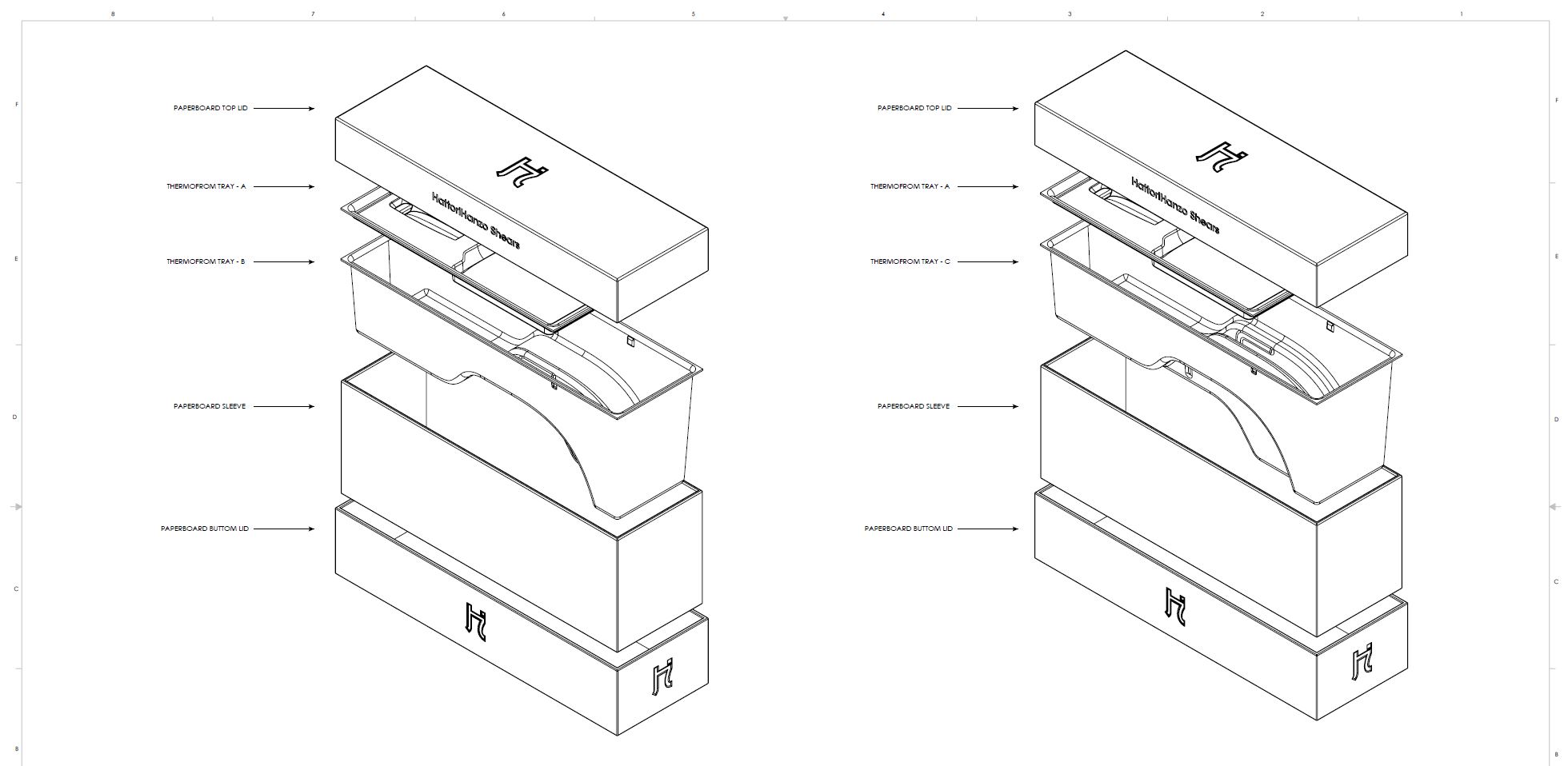 Crafted premium packaging for HattoriHanzo Shears, blending timeless elegance, protective design, and dual-purpose utility. The packaging design securely holds the shears shut and features modular trays that accommodate up to three shears of any size, with stackable elements for versatile storage and display. Each package includes a tension key and shimmy, enhancing both functionality and user experience.