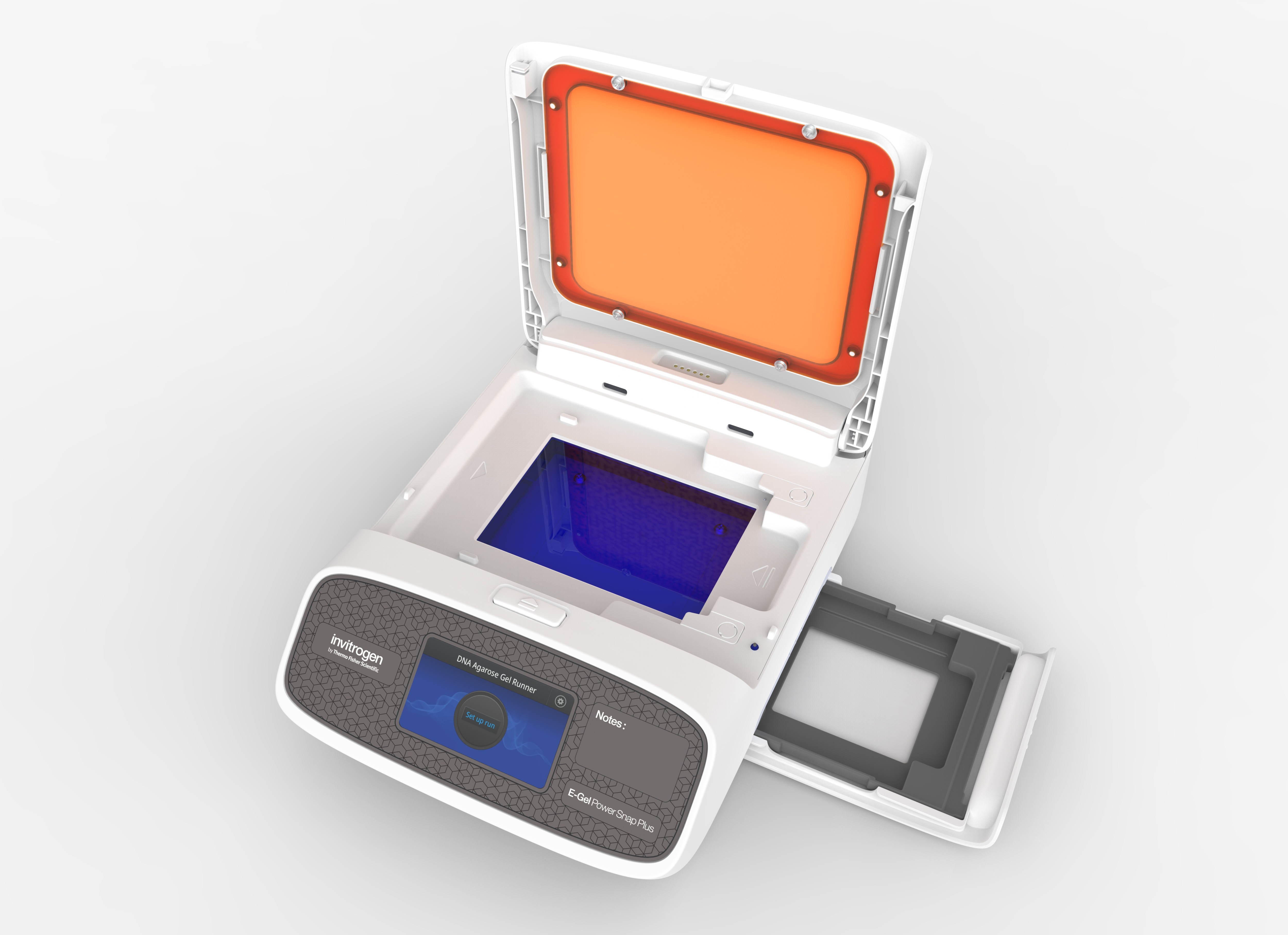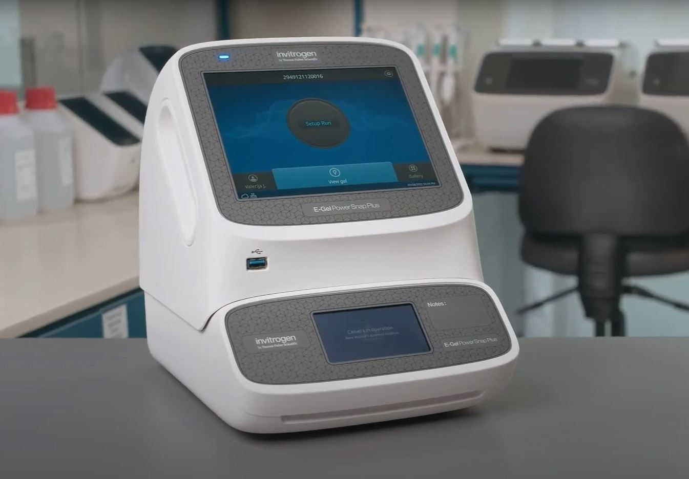 The E-Gel Power Snap System is a compact benchtop instrument that has integrated nucleic acid electrophoresis and gel imaging functionalities. The instrument consists of two main components: the device base and the camera for capturing gel images. It works with precast E-Gel agarose gels, which are buffer-less gels containing SYBR Safe DNA stains and ladders. This eliminates the need to pour gels, prepare buffers, and handle toxic dyes such as ethidium bromide.